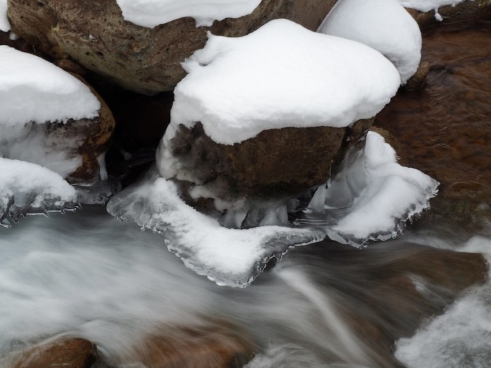 再び氷瀑に到着。この時も誰も居ず再び独占状態。先程は氷瀑ばかり見惚れていましたが、流れる川に目を落とすと「氷クラゲ」が、あちらこちらで泳いで?いました。