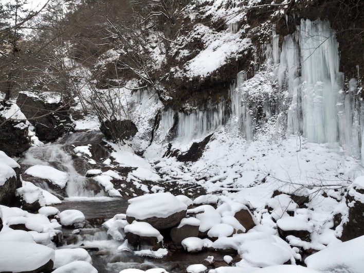 乙女滝の水量は夏と比べるとかなり少なく半分ほど凍っています。滝壺付近には鍾乳石の様な立派な氷柱が出来ていました。