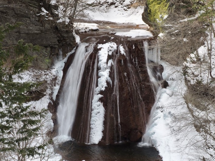 東屋のある展望台から王滝を見下ろすと滝の両サイドに氷柱が見えます。遠くからなので小さく見えますがかなり大きな氷柱のようです。秋の紅葉の王滝もいいですが、冬の雪景色の王滝もいいですね。