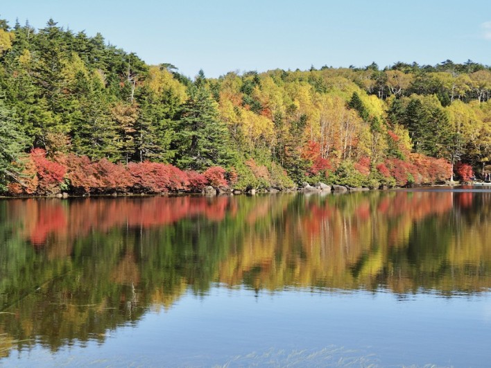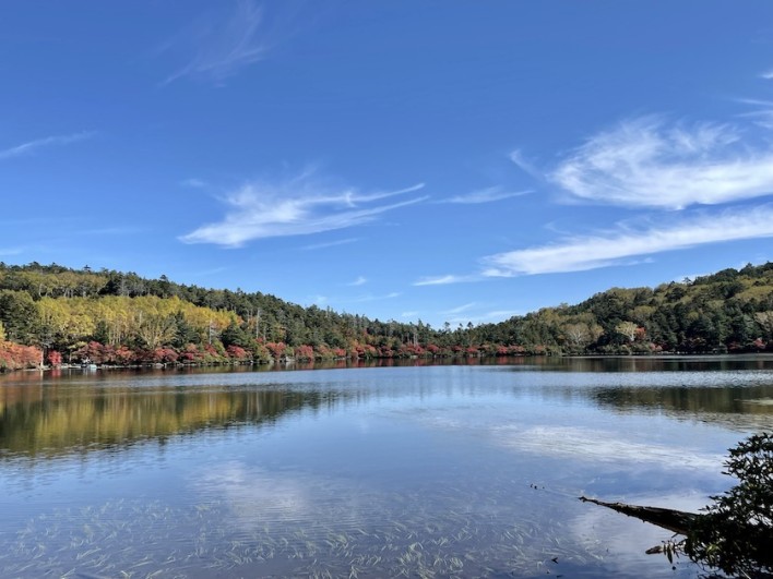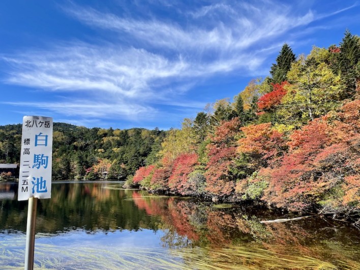 白駒池の紅葉は真っ赤なドウダンツツジの紅葉とダケカンバの黄葉が有名で、それが水面に映る景色が絶景です。