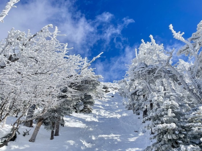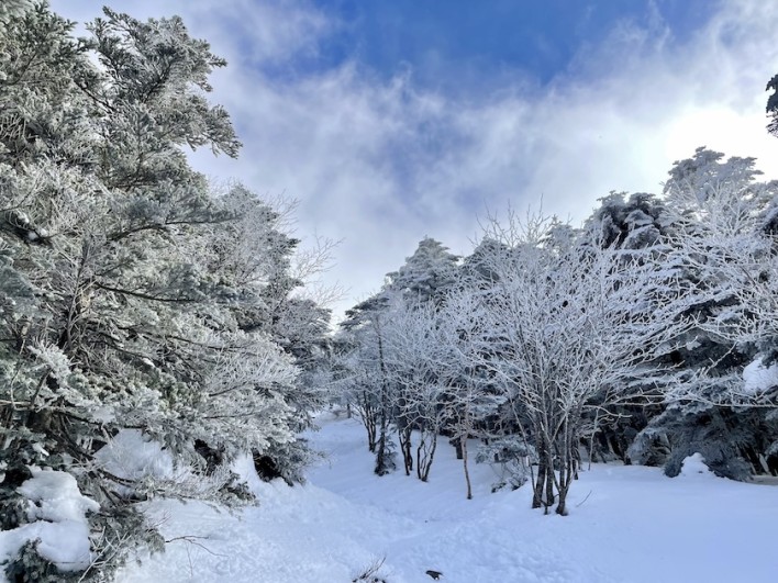 登山開始から約1時間半、周りの木々に霧氷が付き始めました。雲で覆われていた部分まで登って来たようです。