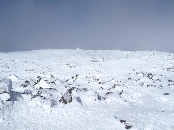 そうなると再び山頂を30分ほどウロウロ。思う存分白と青の世界を満喫しました。10時を過ぎると風が強くなり始めたので下山をすることにしました。