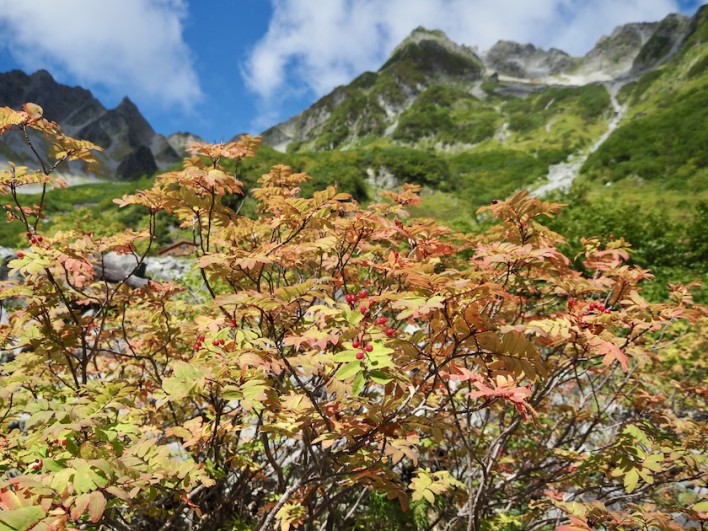 涸沢には午前中には到着。涸沢の気の早いナナカマドが少し色付いていました。全体的にはまだまだで10月に入ってからが見頃になりそうです。