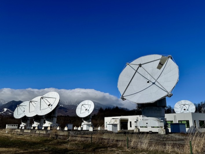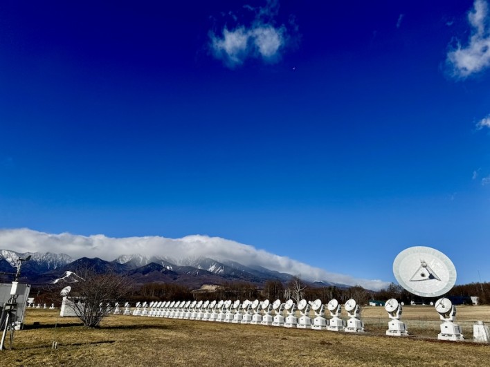 少し歩いて行くと6台のミリ波干渉計のアンテナが迎えてくれます。6台をつなぎ合わせるとなんと直径600mの電波望遠鏡に相当するそうです。現在は運用は終了し他の施設へその技術は受け継がれています。
