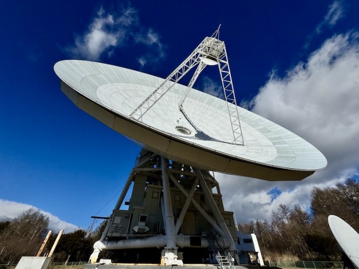 こちらは太陽電波強度偏波計のパラボラアンテナです。太陽からの電波の強さと特性を測定し太陽の周期変動を観測しています。なんと70年以上も測定を続けているそうです。