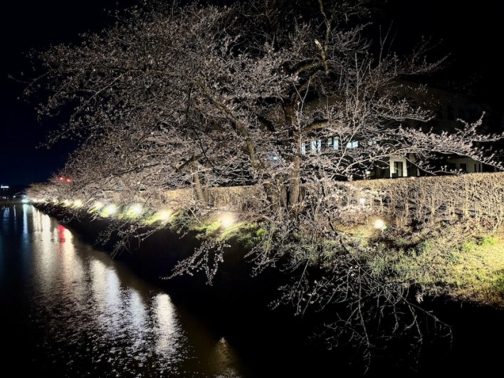 庭園内の見学が終えて黒門から外に出て内堀を見てみるとライトアップされた松本城が綺麗に映し出されていました。その後、光の回廊がある外堀の桜並木へ向かいました。