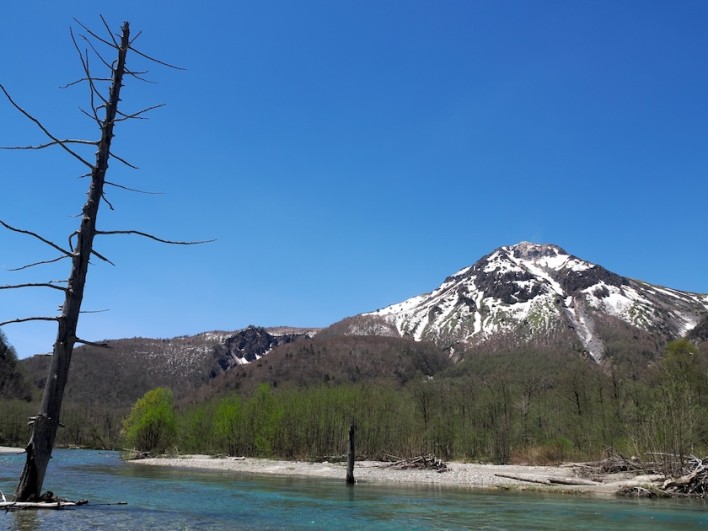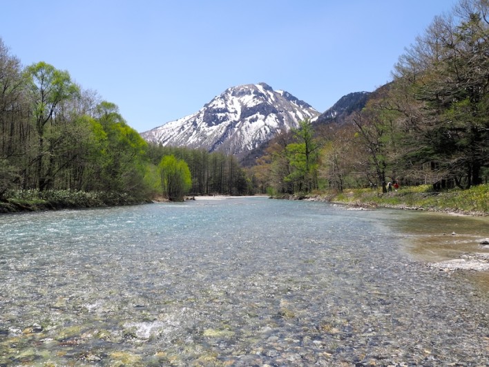 河童橋付近をウロウロしていると丁度バスの出発時間に。約3時間半の滞在でしたが、のんびりと新緑と残雪の上高地を堪能できました。