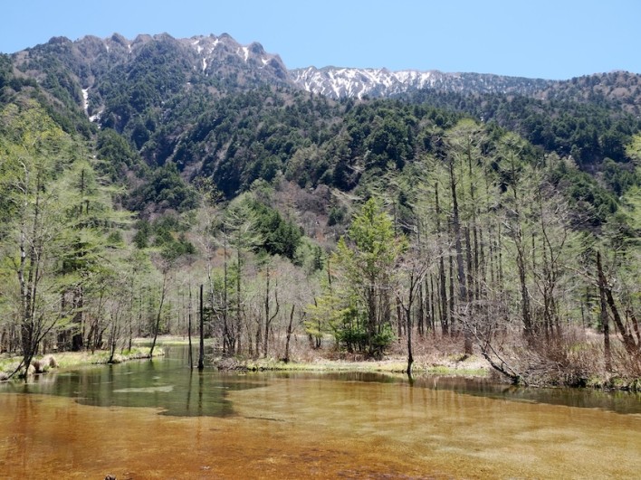 今回は大正池から河童橋までのんびりとトレッキングです。大正池から見える穂高連峰は残雪がたっふり残っていいて迫力満点です。今年は八ヶ岳周辺では雪は少なめでしたが、北アルプスでは例年より多かったようです。