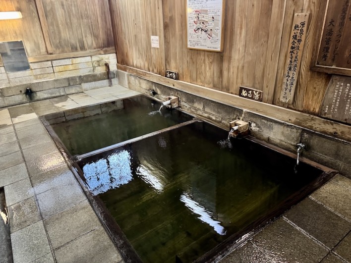最初に温泉街の中心ある「大湯」に立ち寄りました。中に入ると誰もいませんでした。湯船は2つあり、あつ湯とぬる湯に別れています。ぬる湯に入るためぬる湯の湯で掛け湯をすると、熱っ! 全然ぬる湯ではありません、熱々です。水で冷まし湯船をかき混ぜ、いざ入浴! 10秒数えるので限界でした。