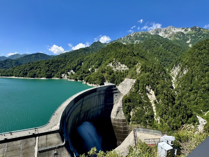 この日は快晴、空はマウンテンブルー、そしてダム湖の水はエメラルドグリーです。向かいの立山連邦のよく見えます。展望台で写真と撮り外階段を降りてダムの上へ向かいました。