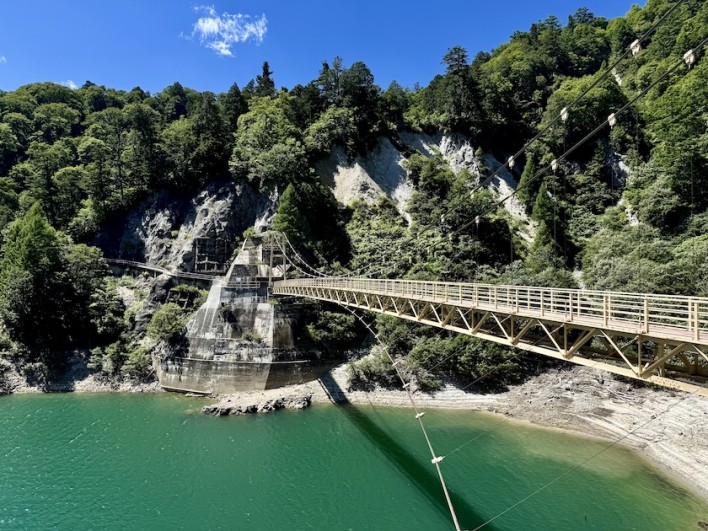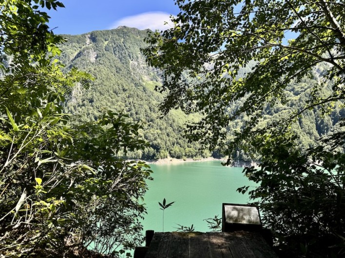 金属製の立派な吊り橋で、橋の上からタムやダム湖、周りの山々を見渡すことが出来ます。その吊り橋を渡ると遊歩道が湖畔沿いに続いています。遊歩道は木陰で涼しくとても快適でした。20分ほど歩くと御山谷半島の展望休憩所があります。