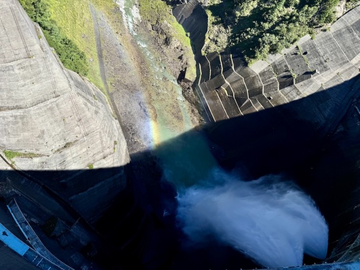 ダムの上に着くと帽子が飛ばされるぐらいの強風が吹いていました。ダムの手すりに風が当たり音がしてダムが歌っているみたいです。手すりの上から放水を覗き込むと虹が掛かっていました。