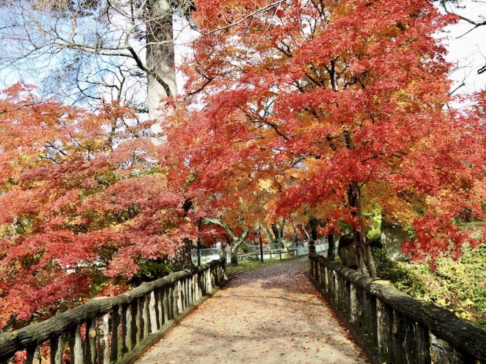 桜の撮影スポットの桜雲橋へ。橋の下の池に降りると桜同様、紅葉も水面にキレイに写し出されていました。春に訪れた時にもみじや楓も意外とあるなあと思っていましたが、調べてみたら城址公園内には約250本も紅葉や楓があるそうです。