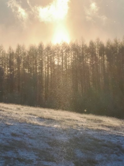 今回の目的は日の出で、ダイヤモンドダストはこれポッチも期待していませんした。さまざまな条件が合わないと見られない気象現象なので超・超ラッキーです。