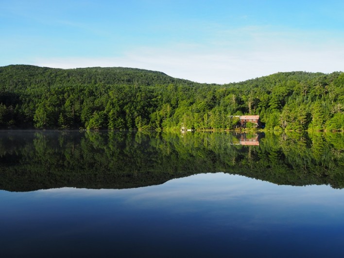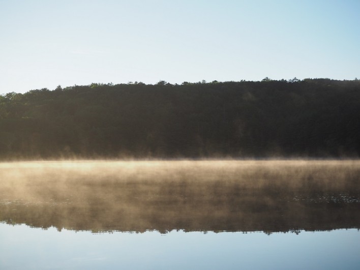 日の当たっている湖面からは朝霧が上がり、とても幻想的でした。