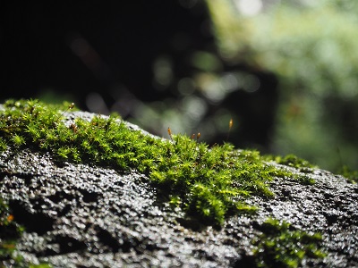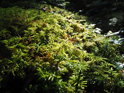 前日に雨が降ったこともあり、森の苔たちは水滴でキラキラ。