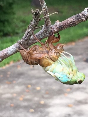 先日、朝6時ごろ玄関前を掃除しているとなにやら動くものが! よく見るとセミの幼虫でした。