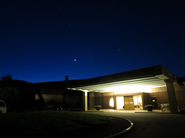 写真の正面玄関上に光っているのは金星、その上に2つ光っている星はふたご座のカストルとポルックルです。