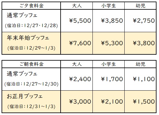 【年末年始】お食事料金のご案内